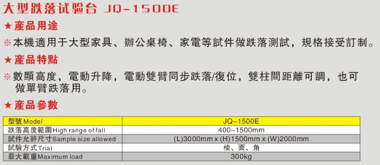 該系列跌落試驗(yàn)臺(tái)主要用于模擬包裝件在運(yùn)輸、裝卸過程中受跌落沖擊的影響程度鑒定包裝件的耐沖擊強(qiáng)度及包裝設(shè)計(jì)的合理性。通過自由跌落對(duì)運(yùn)輸包裝件進(jìn)行垂直沖擊試驗(yàn)試件可事先自由選擇面、棱、角三個(gè)狀態(tài)跌落試驗(yàn),跌落高度可預(yù)置,當(dāng)試件升至預(yù)置高度可自動(dòng)定位,跌落高度可預(yù)置。釋放機(jī)構(gòu)自由靈活,可靠,確保試件在釋放瞬間和自由跌落途中不受任何外力影響,從而確保了試件所要求的跌落狀態(tài)。強(qiáng)構(gòu)科學(xué)合理,使用可靠。